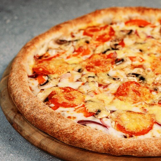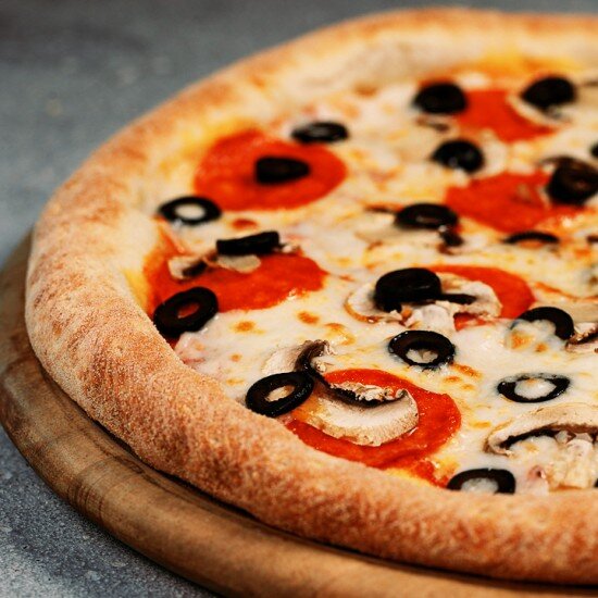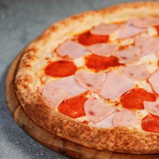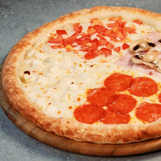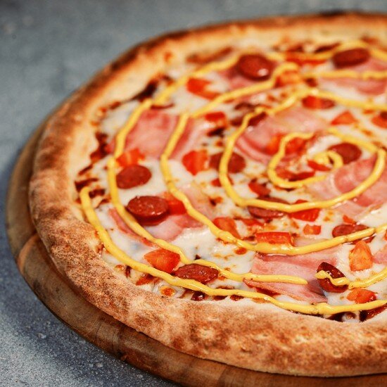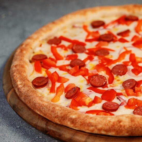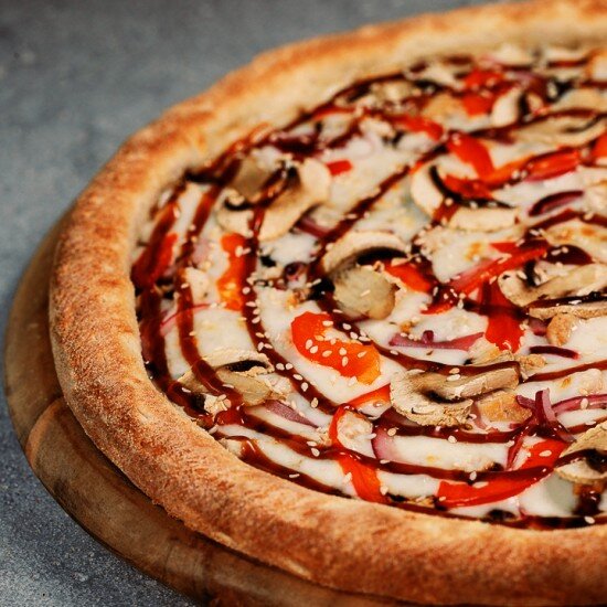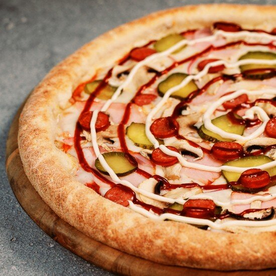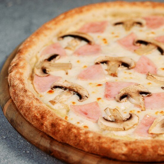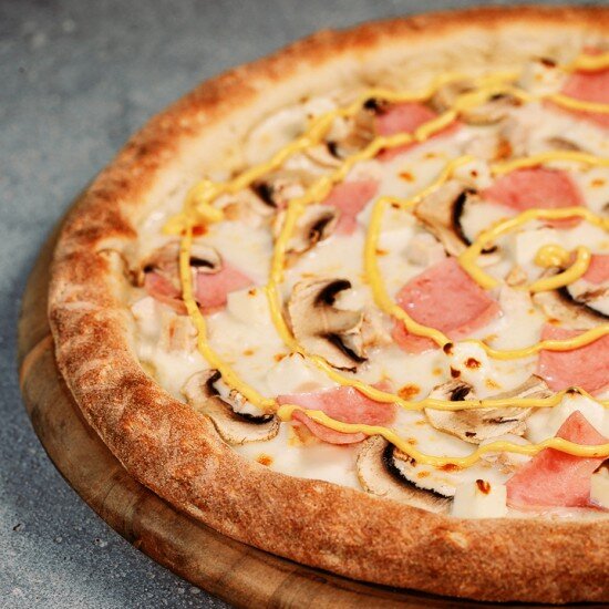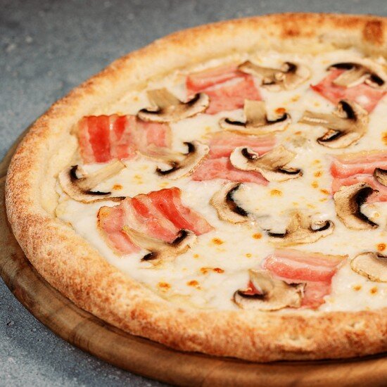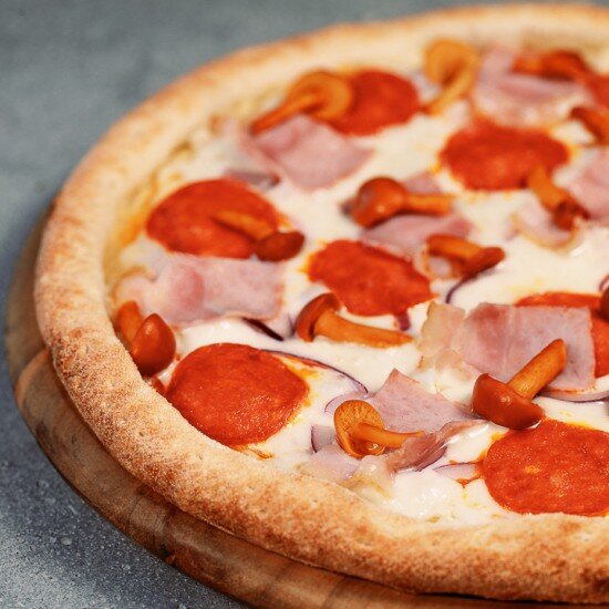 Грибной соус, сыр "Моцарелла", пепперони, шампиньоны, грибной соус.