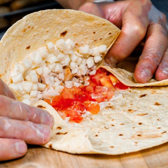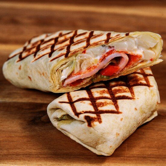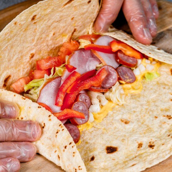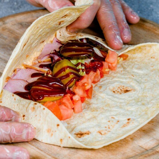 Пшеничная тортилья, грибной соус, бекон варёно-копчёный, ветчина, пармезан, салат айсберг", сыр «Моцарелла».