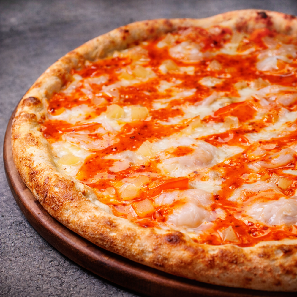 Соус цезарь, сыр "Моцарелла", королевские креветки, ананасы, болгарский перец, сладкий чили соус