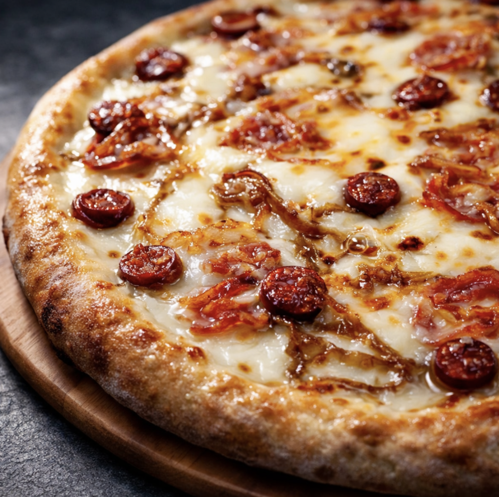 Соус цезарь, сыр «Моцарелла», бекон, охотничьи колбаски, пармезан, карамельный лук.