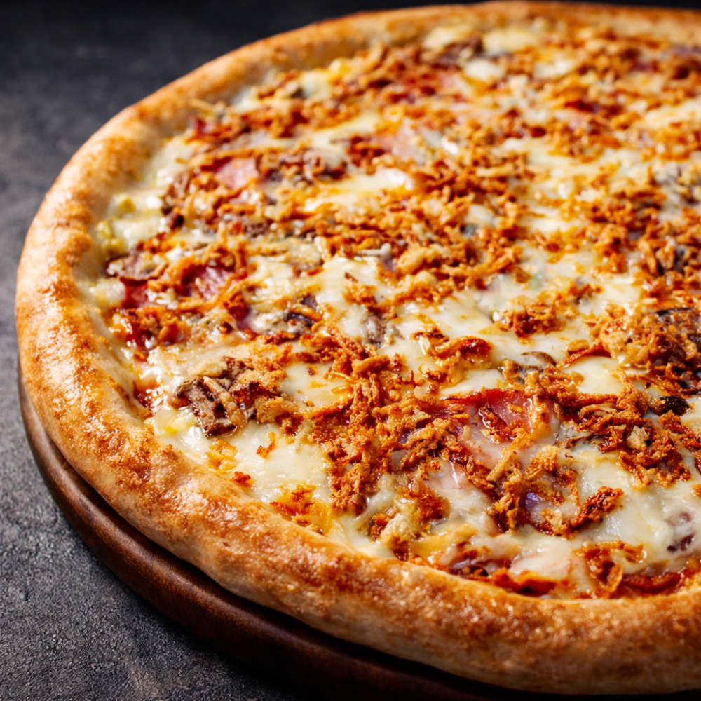Сырный соус, сыр «Моцарелла», шампиньоны, бекон, пармезан, хрустящий лук.