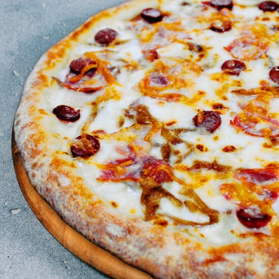 Сырный соус, сыр «Моцарелла», шампиньоны, бекон, пармезан, жареный лук